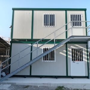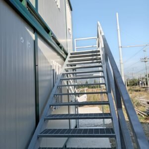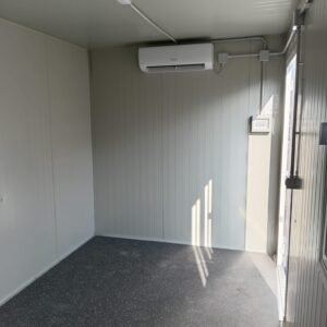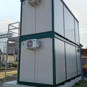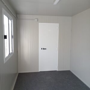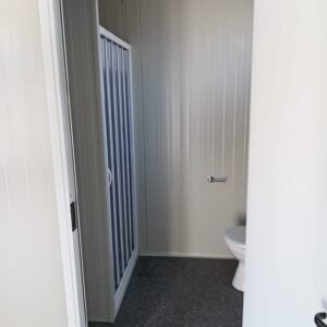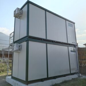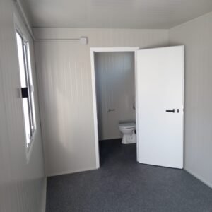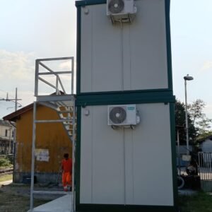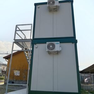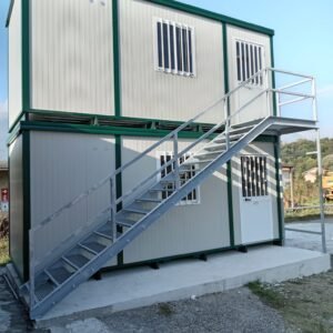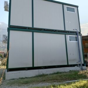 Dimensions à la base 593 x 243 cm. Dimensions au toit 600 x 250 cm. Hauteur intérieure 240 cm Hauteur extérieure 272 cm. Panneau mural ép.40 mm – Polyuréthane 1 Côté extérieur tôle micro-nervurée BG RAL 9002. 1 Côté intérieur tôle micro-nervurée BG RAL 9002. Panneau de toit ép.30+35 mm – Polyuréthane 1 Côté extérieur tôle 5 nervures RAL 9002. 1 Côté intérieur tôle micro-nervurée BG RAL 9002. Soubassement haute portance avec structure tubulaire, revêtu de tôle nervurée, recouvert de bois IDRO V100 ép.18 mm, revêtu de PVC antidérapant. Menuiseries aluminium RAL 9010 Verre 4 mm Transparent. N.1 Porte d'entrée 1 vantail mi-vitrée, complète avec barres anti-intrusion, poignée et serrure standard, dimensions extérieures 100 x 210h cm. N.1 Fenêtre coulissante, complète avec barres anti-intrusion, dimensions extérieures 100 x 100h cm. N.1 Porte pleine 1 vantail, avec poignée et serrure standard, dimensions extérieures 80 x 210h cm. N.1 Vasistas, avec verre 4 mm dépoli, sans barres anti-intrusion, dimensions extérieures 50 x 50h cm. N.1 Porte accordéon couleur GRIS. Installation sanitaire intérieure avec tube MEPLA apparent, comprenant : N.1 WC céramique + abattant + réservoir externe. N.1 Porte rouleau + Balai. N.1 Lavabo céramique 60 cm + colonne + mitigeur. N.1 Étagère + Miroir. N.1 Receveur de douche céramique 90 x 90 cm. N.1 Barre de douche + Mitigeur + Pommeau. N.1 Porte-savon d'angle. N.1 Chauffe-eau électrique 60 Litres. Installation électrique standard norme CEE 220V, avec tube PVC Blanc apparent, comprenant : N.1 Tableau électrique. N.1 Différentiel Général. N.1 Différentiel pour prises. N.2 Interrupteurs. N.2 Prises. N.1 Plafonnier 19W-LED. N.1 Plafonnier 45W-LED. N.1 Convecteur électrique 500W. N.1 Climatiseur Mono Split Inverter BTU 9000-HISENSE. N.1 Boîte extérieure pour raccordement électrique.