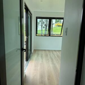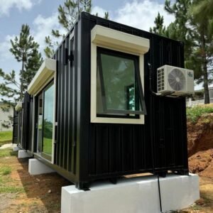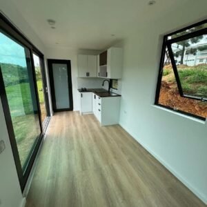 Habitat conteneur design avec grands espaces et conforts modernes. Conteneur 40′ High Cube 1 chambre et 1 salle de bain complète Cuisine en PVC en L et armoire miroir 2 portes coulissantes en verre, climatisation inverter Isolation totale et connexions pour génératrice