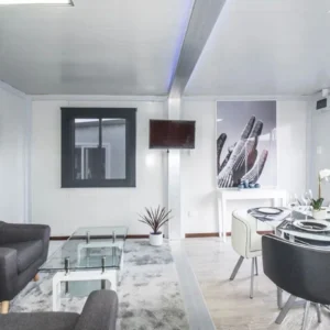 Maison conteneur préfabriquée en acier Q355 HDG, isolée et hautement résistante. Adaptée pour habitations, bureaux, hébergements temporaires et structures modulaires. Structure galvanisée à chaud Isolation toit PU haute densité Murs en EPS ou laine de roche Fenêtres double vitrage Résiste aux vents jusqu'à 210 km/h