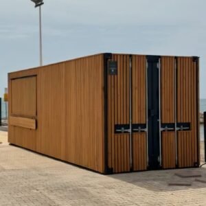 Réalisation d'un kiosque, snack bar, food truck, guinguette dans un conteneur maritime premier voyage. # Pas de dalle béton ! # Aucune préparation ! # Aucun assemblage fastidieux ! # Gros volume ! # Mobile ! # Architecture tendance ! # Pas de permis de construire ! # Sans entretien ! Comprend : 1 conteneur premier voyage 40′ (12mx2,45×2,60m) Ouvertures : 1 Store banne 2000 x 1200 mm 1 Store banne 3000 x 1200 mm 1 porte 800×2000 mm Comptoirs : 1 Comptoir pliant 2000x300mm 1 Comptoir pliant 3000x300mm INSTALLATION ÉLECTRIQUE : 1 tableau 1 rangée 3 luminaires LED étanches 4 prises de service 16A+T 1 interrupteur d'alimentation simple 1 prise rapide Isolation intérieure : Panneau Sandwich Alimentaire 40mm Blanc Couleur : Peinture RAL 7016 sur tout le conteneur.