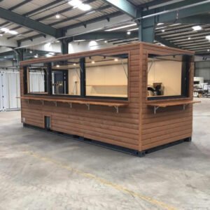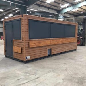 Conteneur bar 20 pieds – cuisine mobile professionnelle Cuisine équipée avec four, frigo, lave-vaisselle Espace optimisé pour service client Structure acier robuste Idéal pour bars mobiles et food trucks Prêt à l'emploi avec équipement inclus