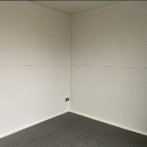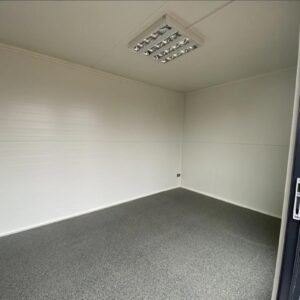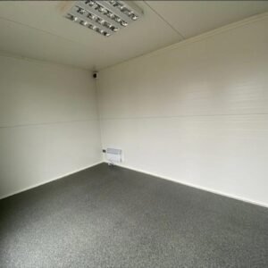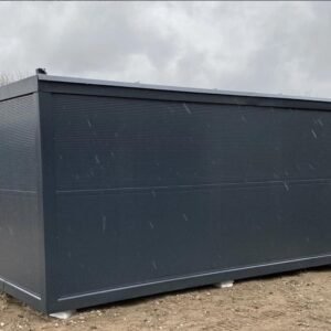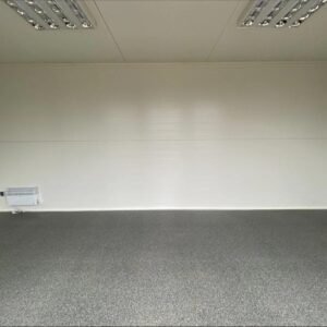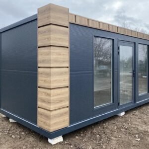 Module commercial isolé de 6 mètres, prêt à l'emploi. Design élégant effet bois Isolation thermique avec panneaux sandwich 10 cm Fenêtres fixes 90×190 cm pour lumière naturelle Installation électrique CE + chauffage intégré Sol PVC résistant