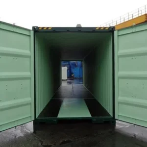 Nouveau conteneur de stockage 40' HC avec hauteur supplémentaire et grand volume intérieur. Idéal pour entrepôt, chantier ou stockage agricole. Hauteur intérieure augmentée Plancher en bois traité (25 mm) Structure en acier soudé 3 mm Volume utile : 31 m³ Ventilé et équipé de doubles portes