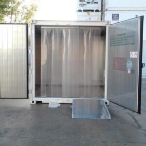 Les caractéristiques de nos chambres froides mobiles les rendent particulièrement utiles lorsque vous travaillez avec des chariots de supermarché, des transpalettes manuels ou des chariots élévateurs électriques car elles ont un sol plat pour rouler facilement et nous disposons de rampes légères supportant jusqu'à 750Kg et de rampes plus robustes supportant jusqu'à 4500Kg. De plus, le système d'éclairage et l'ouverture intérieure de la porte permettent de manipuler les marchandises en toute sécurité à l'intérieur. Avec les chambres froides portables de 3 m/10′ vous pouvez contrôler la température et l'humidité. Nos chambres froides portables couvrent une plage de température programmable de +30ºC à -40ºC avec une température extérieure de +38ºC. Il est également possible de vérifier que la chaîne du froid n'a pas été interrompue pendant le stockage des marchandises grâce à des mécanismes permettant de mémoriser les valeurs de température toutes les 10 minutes afin d'avoir l'esprit tranquille que les marchandises sont en parfait état. Les chambres froides mobiles sont des conteneurs maritimes réfrigérés avec des modifications pour faciliter leur utilisation comme entrepôt frigorifique, comme par exemple : Ouverture des portes type chambre froide. Ouverture intérieure. Éclairage intérieur. Alarme homme bloqué. Rideau à lanières. Sol plat pour faciliter l'utilisation de transpalettes ou de chariots élévateurs. Rampe en option. Si vous êtes intéressé par la location ou l'achat d'une de nos chambres froides portables, visitez la section offres où vous trouverez les offres les plus intéressantes ou contactez-nous. Nos représentants commerciaux répondront à toutes vos questions ou problèmes et vous feront une offre de location ou de vente adaptée à vos besoins.
