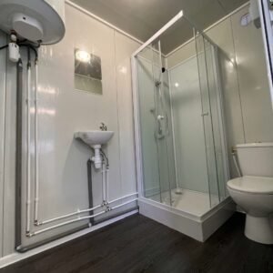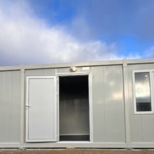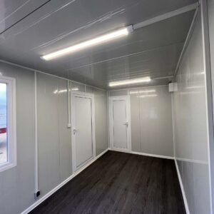 Photos contractuelles (Module vendu en parfait état comme présenté sur les photos) Les caractéristiques énumérées ci-dessous sont les caractéristiques standard de ce module. Vous pouvez passer commande directement si ces caractéristiques vous conviennent. Pour tous vos besoins de personnalisation, contactez-nous. Spécifications : Dimensions Dimensions extérieures (LxPxH) : 5,95 x 2,4 x 2,5 m Dimensions intérieures zone sanitaire : 1,50 m x 2,20 m Dimensions intérieures zone réception : 4,30 m x 2,20 m Murs et toit Matériau : panneaux sandwich Isolation : Mousse de polyuréthane rigide Épaisseur du mur : 50 mm Épaisseur du plafond : 40 mm Couverture du plafond : Tôle d'acier galvanisé à ondes grecques Châssis Description : Acier galvanisé et laqué Épaisseur : 2 mm Toit : hauteur 250 mm Manutention : 4 prises en toit pour crochets de levage PLANCHER Structure : Panneaux en fibrociment Épaisseur : 16 mm Revêtement : PVC MENUISERIE Porte : 1 porte extérieure en aluminium dim.90 x 200 cm. 1 porte intérieure en aluminium dim.80 x 200 cm. Fenêtres : 2 fenêtres PVC dim. 100 x 100 cm, double vitrage, 1 vantail ÉLECTRICITÉ Éclairage : 2 néons LED Prises : 2 prises de courant Tableau : 1 tableau comprenant interrupteur différentiel et disjoncteurs Interrupteur : 1