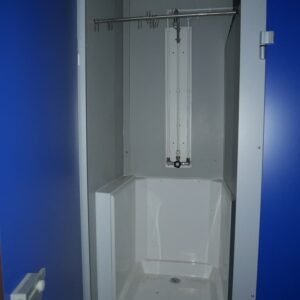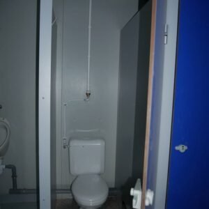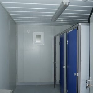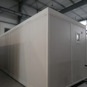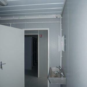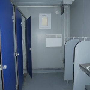 Photos contractuelles (Module vendu en parfait état comme présenté sur les photos) Les caractéristiques énumérées ci-dessous sont les caractéristiques standard de ce module. Vous pouvez passer commande directement si ces caractéristiques vous conviennent. Pour tous vos besoins de personnalisation, contactez-nous Spécifications : Dimensions (LxLxH) : 8,20 x 2,92 x 2,92 m – 1 structure de 8,20 x 2,92 m avec hauteur sous plafond de 2,48 m en acier galvanisé laqué blanc – Panneaux muraux avec isolation en mousse polyuréthane de 40 mm – Toit en tôle galvanisée – Isolation en laine de verre de 100 mm – Revêtement de plafond en bac acier blanc – Sol en résine Menuiserie : – Une porte extérieure pleine de 0,90 m – 2 châssis hauts de 0,40 m x 0,50 m – 2 portes intérieures isoplane de 0,80 m Équipement : – Tableau électrique triphasé – Double fluorescent avec grille et 2 fluorescents simples étanches – Convecteurs électriques : 2 de 1000 W – Ballon d'eau chaude 300 litres – 1 abreuvoir avec 4 points d'eau et 1 abreuvoir avec 2 points d'eau – Toilettes anglaises : 3 – Urinoirs : 3 – Receveurs de douche : 3