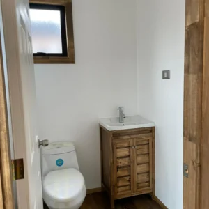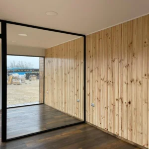 Module moderne de 24 m² avec salle de bain et grandes baies vitrées. Structure en acier noir mat Intérieurs en bois et plaques de plâtre lisses Salle de bain équipée + installation électrique complète Isolation en polyuréthane et laine de verre Grandes fenêtres en aluminium à rupture thermique