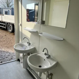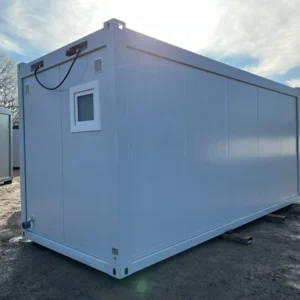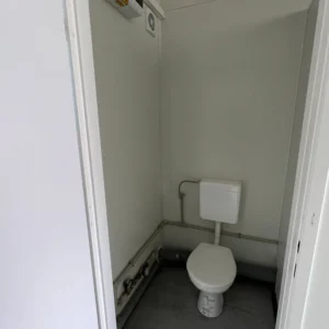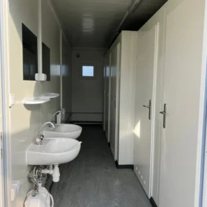 Module Sanitaire 6×2,44 m – 5 WC Indépendants et Lavabos Intégrés 5 cabines WC avec serrure 2 lavabos avec eau chaude Sol PVC antidérapant Isolation en laine minérale Éclairage LED et chauffage Fenêtres en lucarne + barre de grue