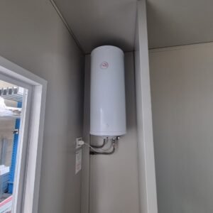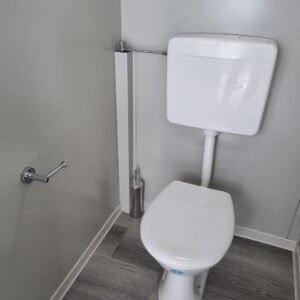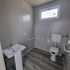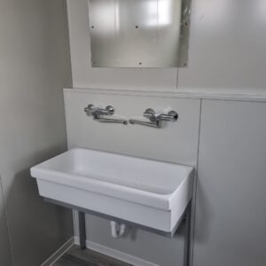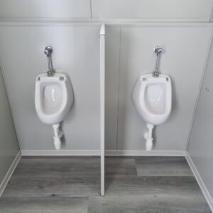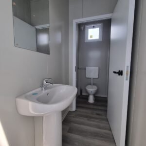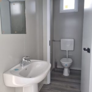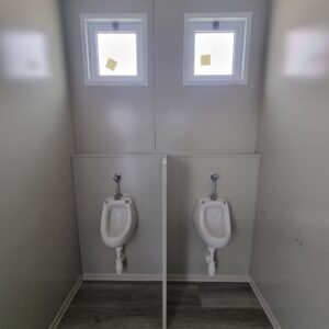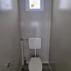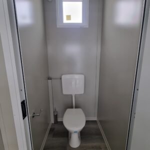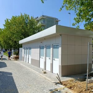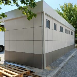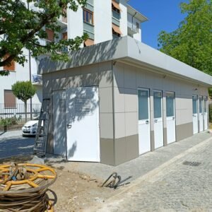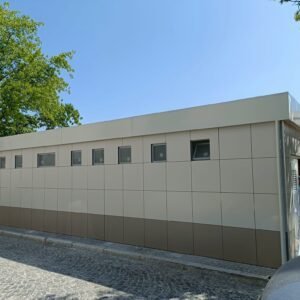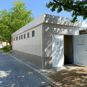 Inclus avec la conception, pour permis de construire : Conception structurelle de bâtiment métallique, (hors calcul ou vérification des fondations). Rédaction de note de calcul selon normes en vigueur, y compris préparation documentation pour dépôt en mairie. No.1 Module avec dimensions base 1023 x 293 cm. No.1 Module avec dimensions toit 1030 x 300 cm. No.1 Module avec dimensions toit 1030 x 50 cm. Hauteur intérieure 270 cm Hauteur extérieure 342 cm. Panneau mural et premier toit ép.100 mm – Polyuréthane 1 Côté extérieur tôle LISSE BG RAL 9002. 1 Côté intérieur tôle LISSE BG RAL 9002. Soubassement haute portance avec structure tubulaire revêtu de tôle nervurée, revêtu de Panneau mural ép.100 mm Polyuréthane, recouvert de bois CIMENT ép.16 mm, recouvert de sol vinyle modulaire teinte GRIS CLAIR. Second toit, pour meilleure isolation, étanchéité maximale et durabilité, avec structure tubulaire et tôlerie pliée, un seul pan, revêtu de : Panneau toit ép.30+35 mm – Polyuréthane 1 Côté extérieur tôle 5 nervures RAL 9002. 1 Côté intérieur tôle Micro-nervurée BG RAL 9002. Bande de rive périphérique RAL 9002, complète avec descentes d'eau au sol. Dimensions 1050 x 370 cm. Menuiseries Aluminium RAL 9010. Double vitrage 4/9/4mm imprimé. No.1 Porte pleine tout panneau deux vantaux, avec poignée et serrure standard, dimensions extérieures 200 x 210h cm. No.4 Portes pleines tout panneau un vantail, avec poignée et serrure standard, dimensions extérieures 80 x 210h cm. No.2 Portes pleines tout panneau un vantail, avec poignée standard et serrure libre/occupé, dimensions extérieures 100 x 210h cm. No.5 Portes pleines tout panneau un vantail, avec poignée standard et serrure libre/occupé, dimensions extérieures 80 x 210h cm. No.11 Fenêtres oscillo-battantes, dimensions extérieures 50 x 50h cm, complètes avec moustiquaire fixe. No.1 Fenêtre oscillo-battante, dimensions extérieures 100 x 50h cm, complète avec moustiquaire fixe. Installation électrique complète avec rapport, encastrée, comprenant : No.1 Tableau électrique. No.1 Différentiel Général. No.1 Plafonnier 45W-LED. No.11 Plafonniers 19W-LED. No.7 Interrupteurs. No.7 Prises. No.1 Boîte de raccordement extérieure. Installation sanitaire intérieure, avec tube MEPLA 20mm, encastrée, comprenant : No.1 Salle de bain handicapés complète (WC + Lavabo céramique) et barres d'appui. No.1 Lavabo céramique 90 cm + Structure + No.2 Mitigeurs. No.1 Miroir. No.5 WC céramique + Abattant + Réservoir externe. No.2 Urinoirs céramique. No.5 Porte-rouleau + Balai. No.4 Lavabo céramique 60 cm + Colonne + Mitigeur. No.4 Miroir. No.1 Chauffe-eau électrique 60 litres, eau chaude. Revêtement extérieur périphérique avec sous-structure revêtue de carreaux HPL (Finition imitation bois)