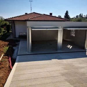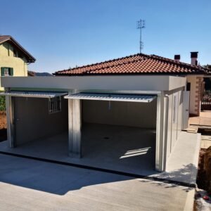 No.2 Unités avec dimensions base 593 x 293 cm. No.2 Unités avec dimensions toit 600 x 300 cm. Hauteur intérieure 240 cm Hauteur extérieure 277 cm. Panneau mural ép.40 mm – Polyuréthane 1 Côté extérieur tôle micro-nervurée BG RAL 9002. 1 Côté intérieur tôle micro-nervurée BG RAL 9002. Panneau de toit ép.30+35 mm – Polyuréthane 1 Côté extérieur tôle 5 nervures RAL 9002. 1 Côté intérieur tôle micro-nervurée BG RAL 9002. Sans soubassement. Complet avec No.10 Équerres pour fixation sur votre base existante. Second toit, pour meilleure isolation, étanchéité maximale et durabilité, avec structure tubulaire et tôlerie pliée, un seul pan, revêtu de : Panneau toit ép.30+35 mm – Polyuréthane 1 Côté extérieur tôle 5 nervures RAL 9002. 1 Côté intérieur tôle Micro-nervurée BG RAL 9002 Bande de rive périphérique RAL 9002, complète avec descentes d'eau au sol. Dimensions 620 x 620 cm. No.2 Portes basculantes galvanisées, avec ouverture motorisée, complètes avec poignée et serrure standard et contrepoids de sécurité. No.2 Fenêtres aluminium RAL 9010, avec verre 4 mm transparent, ouverture coulissante, dimensions extérieures 100 x 100h cm. Installation électrique standard norme CEE 220V, avec tube PVC apparent, comprenant : No.1 Tableau électrique. No.1 Différentiel Général. No.1 Différentiel pour prises. No.2 Interrupteurs. No.2 Prises. No.4 Plafonniers 45W-LED. No.1 Boîte extérieure pour raccordement électrique.