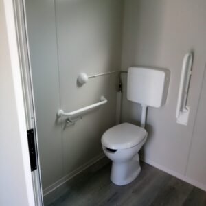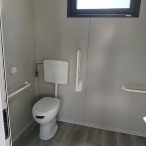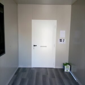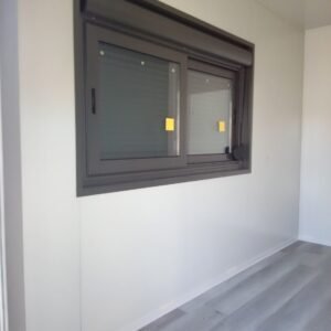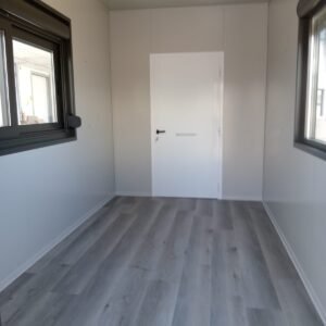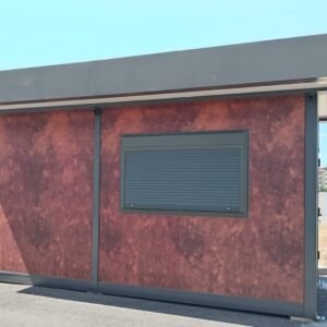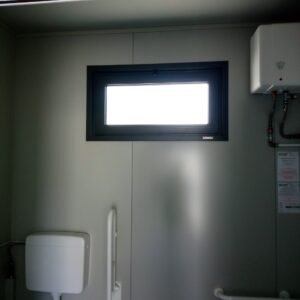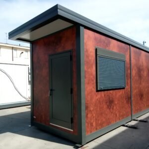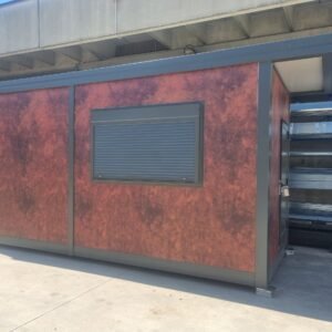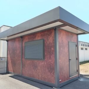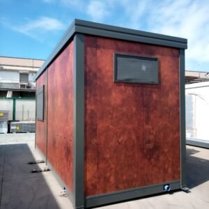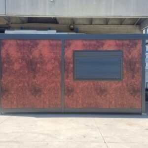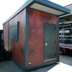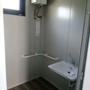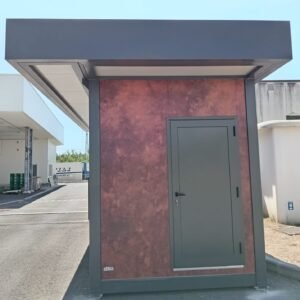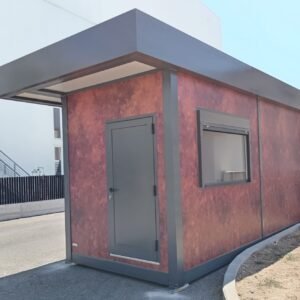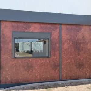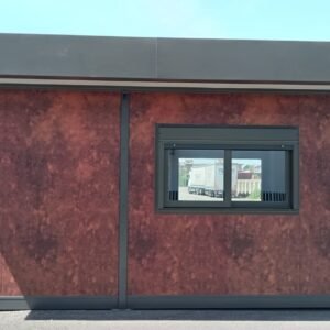 Inclus avec la conception, pour permis de construire : Conception structurelle de bâtiment métallique, (hors calcul ou vérification des fondations). Rédaction de note de calcul selon normes en vigueur, y compris préparation documentation pour dépôt en mairie. Conception de système hydro-thermo-sanitaire, pour monobloc GUÉRITE. Rédaction du Rapport Énergétique pour bâtiment neuf : avec vérifications numériques des paramètres légaux minimaux avec analyse des stratigraphies de projet et vérification des ponts thermiques (absence de condensation interstitielle) ; avec vérification du respect des obligations d'intégration des énergies renouvelables Fourniture d'assistance technique, pour la compilation de documentation technique, pour le projet d'installation électrique, au service du monobloc GUÉRITE PG8608 R03. La mission comprendra plans, schéma de tableau électrique, dimensionnements et petit rapport technique. Hors rapport énergétique et APE. No.1 Module avec dimensions base 590 x 343 cm. No.1 Module avec dimensions toit 670 x 250 cm. No.1 Module avec dimensions toit 670 x 70 cm. Hauteur intérieure 270 cm Hauteur extérieure 344 cm. Total 25 m² Panneau mural et premier toit ép.100 mm – Polyuréthane 1 Côté extérieur tôle LISSE BG RAL 9002. 1 Côté intérieur tôle LISSE BG RAL 9002. Soubassement haute portance avec structure tubulaire, revêtu de tôle nervurée, revêtu de Panneau mural ép.100 mm Polyuréthane, recouvert de bois IDRO V100 ép.18 mm, recouvert de sol vinyle modulaire teinte GRIS CLAIR. Second toit, pour meilleure isolation, étanchéité maximale et durabilité, avec structure tubulaire et tôlerie pliée, un seul pan, revêtu de : Panneau toit ép.30+35 mm – Polyuréthane 1 Côté extérieur tôle 5 nervures RAL 9002. 1 Côté intérieur tôle Micro-nervurée BG RAL 9002. Bande de rive périphérique RAL 7022, complète avec descentes d'eau au sol. Dimensions 690 x 340 cm. Menuiseries Aluminium RAL 7022. Double vitrage 4/9/4 transparent. No.1 Porte mi-vitrée un vantail, avec poignée et serrure standard, dimensions extérieures 100x210h cm. No.1 Fenêtre coulissante, complète avec moustiquaire coulissante, dimensions extérieures 200 x 100h cm. No.1 Fenêtre fixe, dimensions extérieures 180 x 100h cm. No.1 Porte pleine tout panneau un vantail, avec poignée standard et serrure libre/occupé, dimensions extérieures 100 x 210h cm. No.1 Vasistas salle de bain, complet avec moustiquaire fixe extérieure, dimensions extérieures 100 x 50h cm. Hors installation électrique Hors installation photovoltaïque et ligne de vie (à installer sur place à votre charge). Installation sanitaire intérieure avec tube MEPLA apparent, comprenant : No.1 Salle de bain handicapés (WC + Lavabo céramique) complète avec barres d'appui. No.1 Chauffe-eau électrique 15 litres, eau chaude. Revêtement façades périphériques avec film adhésif – finition couleur CORTEN.