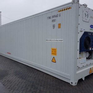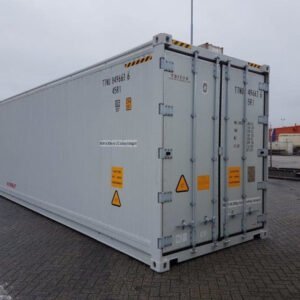 Le nouveau conteneur réfrigéré 40 pieds, également appelé conteneur réfrigéré 12 m, est largement utilisé pour les activités de stockage de produits frais. Le conteneur réfrigéré 40′ est alimenté par une prise 380V. Il est équipé de machines fonctionnant dans une plage de température comprise entre +25°C et -25°C. Tous nos conteneurs réfrigérés Reefer sont dotés d'un certificat CSC Veritas et d'un test PTI (refrigeration unit test) valide. Nous travaillons avec des moteurs Carrier, Thermoking, Daikin et Starcool. DIMENSIONS INTÉRIEURES -Longueur : 11 583 mm -Largeur : 2294 mm -Hauteur : 2 569 mm -Hauteur intérieure (jusqu'à la limite de charge) : 2 469 mm Dimensions extérieures – Longueur : 12 192 mm – Largeur : 2438 mm – Hauteur : 2 896 mm Dimensions de la porte -Largeur : 2292 mm -Hauteur : 2 562 mm Température : de -25 à 25°C Réfrigérant -R134A -R404 -R442 sur demande Structure : CORTEN et INOX SOL GUIDE EN ALUMINIUM TYPE T Gestion via console Daikin, Thermoking ou Carrier Stockage jusqu'à 23 Europalettes Ouverture à double vantail sur une des faces externes Les portes s'ouvrent à 270° Informations complémentaires – Charge maximale : 29 350 kg – Poids à vide : 4 650 kg – Poids maximum : 34 000 kg – Volume intérieur utile (jusqu'à la ligne de ventilation maximale) : 65,60 m3
